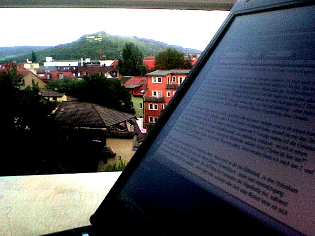 Am späten Nachmittag bin ich wieder in Jena, setze mich in die Uni-Bibliothek, zu den Historikern im dritten Stock (die, Jenaer Gerüchten zufolge, zu den ungepflegteren Studenten gehören). Herrlich! Ich sitze an einem kleinen Schreibtisch – leider kein Internetzugang – sehe hin und wieder durch die Glasfront, die das hübsche Panorama der Hügelkette feil bietet, während die StudentInnen vor sich hin arbeiten. Jeder tippt oder schreibt oder liest oder flüstert leise vor sich her und hin. Genau das Richtige, um die literarischen Wunden an ‚Tiret‘ zu lecken. Siehe da. Schon wurde der Prolog entschlackt und komprimiert. Gut so. Und jetzt geh ich zu T. – werde mir den Bauch vollschlagen, bis ich platze. Was wohl ihr Freund W. dazu sagen wird?