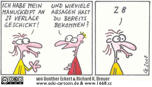 Ecki & Rik arbeiten an einem Comic, das die Höhen und Tiefen der angehenden Schriftstellerei zum Thema hat. Das Besondere: die Cartoons können Auszugsweise oder zur Gänze für nicht-kom- merzielle Zwecke (CC-License) verwendet werden (zum Beispiel um sein Blog oder WebSite aufzupeppen). Einzig die Nennung der Autoren, sowie die Information (= Link setzen). dass das Werk unter einer Creative Commons Lizenz fällt, ist verpflichtend.