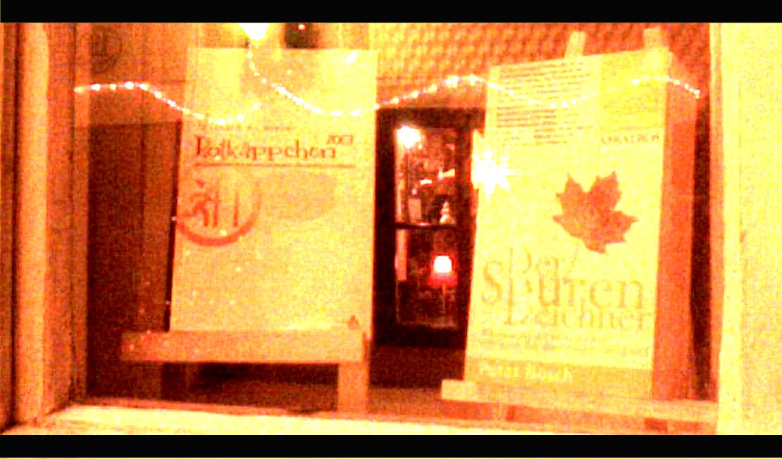 Nachdem ich sie Tage zuvor unentgeltlich beraten hatte, welche Bilder wo anzubringen sind, ließ ich kurzerhand drei original- verpackte Exemplare von „Rotkäppchen 2069“ dort und bedrängte, pardon, becircte sie solange, bis sie eines in das Fensterchen stellte, auf dass es jedermann und jederfrau sehen kann, wenn er oder sie es denn möchten. Völlig gerührt musste ich ein Foto davon machen. Ach, was bin ich stolz auf mich! Äh, ja, ein großes Dankeschön geht selbstverständlich an Mademoiselle M.