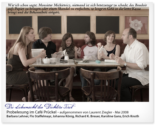 Fans, die den Künstler protegieren, die ihm Geld in die Hand drücken oder überweisen, um ihn zu ermutigen, weiterzumachen; die bereit sind, eine seiner Socken (natürlich nur getragen!) bei eBay um teures Geld zu ersteigern; die weite Distanzen auf sich nehmen, um ihren Künstler leibhaftig zu begegnen und ihn zu hofieren, zu gratulieren (und ihn nicht windelweich prügeln, weil er im letzten Roman „Fifi“, den Hund des Protagonisten, von einem Panzerwagen überrollen ließ)?