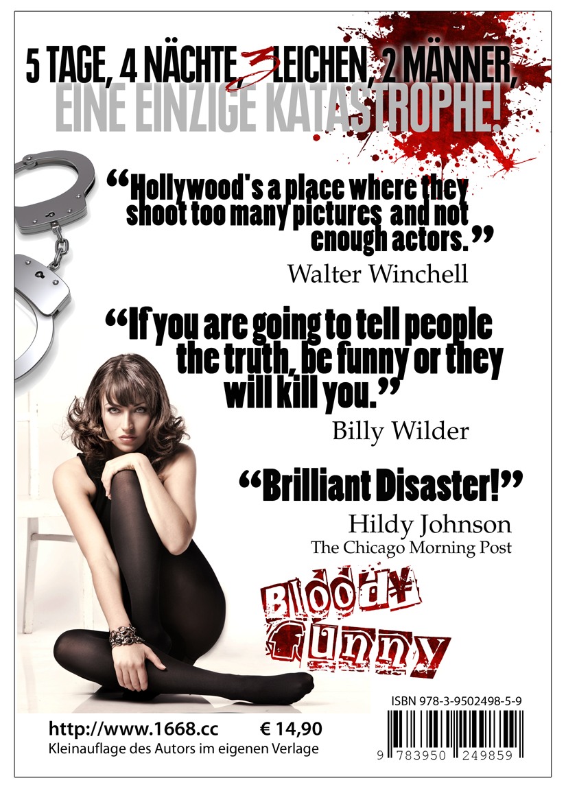 Zur Vorderseite, die U1, gibt es natürlich eine schöne Rückseite – die U4, wie man in Profi-Kreisen zu sagen pflegt. Wie wir sehen können, sind auch hier die Handschellen sehr präsent. Auch da gilt: kein Gimmick, sondern genauso relevant, wie die Blutspritzer und die Dame, die gar zwider schaut. Die beiden Loglines („Hollywood kommt nach Wien …“ und „5 Tage …“) bringen den Inhalt des Buches gut auf den Punkt. Was will man mehr? Der A4-Ausdruck der Vorderseite knallt übrigens ganz schön heftig – da könnte man den Titel vermutlich noch vom Satelliten aus sehen. Sodala. Genug für heute. Ich spanne ab.
