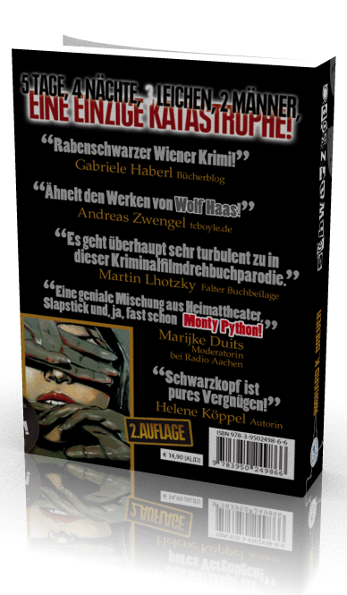 Zu Hause angekommen, also am Freitag, 13. November (!), musste ich noch die eine oder andere Änderung machen. Erhöhte den Kontrast der grauen Schrift auf der Rückseite (U4), sowie die Tagline („5 Tage, 4 Nächte, 3 Leichen, 2 Männer, eine einzige Katastrophe“). Das vormals eher dunkle Rot von „eine einzige Katastrophe“ wurde leuchtender gemacht. Auf der Vorderseite wechselte ich das „gelbliche Grau“ in ein „weißes Grau“ aus. Hopefully, dass es dann so wird, wie ich es mir vorstelle. Die letzten Tage immer wieder mit meinem Muster im Gepäck die Leute „beglückt“. TC., sonst strengste Kritikerin meiner Werke, meinte, es sei perfekt (sie hatte aber bereits zwei Glaserln Wein intus!). Und auch sonst gab es keine harsche, niederschmetternde Ablehnung. Gut so. Darauf kann man aufbauen. Das Werkpapier von Munken 90m² und 1,5Volumen ist fantastisch. Es hat für die Seitenzahl (304) und die Größe (13,5 x 19 cm) die perfekte Anmutung. Ich könnte stundenlang mit dem Buch in der Hand herumtun. Aufblättern. Zublättern. Aufschlagen. Zuschlagen. Die Klappen (9 cm!) erfreuen sich größter Beliebtheit. Weil sie sich so schön ins Gesamtbild einfügen. Und die Innenseite, die ist bitteschön bedruckt. Was bin ich froh, dass mir diese Idee noch gekommen ist. Kostete ein paar Cent mehr und gibt gleich eine Menge her. Huh. Wir sehen: die anfängliche Enttäuschung ist einer großen Zufriedenheit, beinahe bin ich versucht zu sagen: Glückseligkeit, gewichen. „Schwarzkopf B.E.“ hat Kultpotenzial. Ist es zu hoch gegriffen? Vielleicht. Aber ich spreche von Möglichkeiten. Von Visionen. Von Hoffnungen. Und das muss bitteschön erlaubt sein. Immer. Freilich, die Gefahr, sich lächerlich zu machen, hat man wohl oder übel in Kauf zu nehmen.
