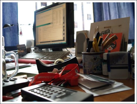 Die gute Uschi Fuchs, in den Weiten des virtuellen Webs auch als Foxy bekannt (klingt das nur für mich nach Sixties, Minirock und London?), warf mir ein S t e c k e r l zu. Prinzipiell halte ich ja von diesen „Sag mir, was du gerade tust!“-Aktionen nicht viel. Aber weil ich sie erst kürzlich beim Webmontag kennen lernte und sie ein ganz ein sympathischer Fuchs ist, dachte ich mir, man(n) will es sich nicht mit ihr verscherzen und tut, wie einem geheißen. Noch dazu, wo es um den Schreibtisch geht. Und der ist ja bei mir im Lebensmittelpunkt. Ich verbringe sicherlich mehr Zeit mit meinem Tisch als mit meinem Bett. Period! Und dass ich früher meine Blog-Einträge (damals waren es mehr virtuelle Essays) immer mit einem Foto meines Schreibtisches verhübschte, ist der Vollständigkeit halber erwähnt.
