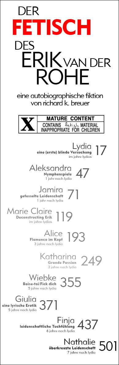 Die autobiographische Fiktion Der Fetisch des Erik van der Rohe ist mit heute in der ersten Version abgeschlossen. Nun wird sich zeigen, ob dieses Konvolut von 574 Taschenbuchseiten an seelischen Einblicken und erotischen Phantasien literarisch bestehen kann. Sieht so aus, als müsste ich mir jetzt Penly zur Brust nehmen. Und das Sachbuch sollte ich ja auch nicht aus den Augen verlieren. So nebenbei ist es nun fixiert, dass ich mit einem Stand auf der Wiener Buchmesse Ende November vertreten sein werde. Dort sollte ich in jedem Fall ein neues Werk präsentieren. Davon später mehr. Zwischenzeitlich überlege ich mir den Fetisch-Roman in die zehn Kapitel zu zerlegen und Stück für Stück als ebook anzubieten. Eine mehrseitige Leseprobe könnte ich auf der Messe unters interessierte Lesevolk bringen. Mal schauen, was meine Lektorin dazu sagt. Sie ist ja im Moment damit beschäftigt, Madeleine die Fehler und Flausen auszutreiben.