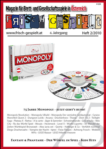 frisch gespielt Ausgabe 02/2010: Monopoly Revolution – Monopoly UBuild – Monopoly Der verrückte Geldautomat – Cyrano – Munchkin Quest 2 – Dungeon Lords – Arcana – Drachenherz – Titania – Dixit 1 & 2 – Twilight Saga – Plateau X – Rattus – A la carte – Jäger & Sammler – Schweinebande – Giro d’Italia – Velo City – Ra das Würfel Spiel – Mosaix – Heckmeck – Level X – Würfel Ligretto – Im Wandel der Zeiten Würfelspiel Bronzezeit – Alea iacta est – Quirrly – Haflinger & Co – Verfühlt nochmal – Diego Drachenzahn – Vampire der Nacht – tiptoi – Fiese Fliegen – Achtung Frosch – Wobble – MiYu – LEGO Bazaar – LEGO Atlantis treasure