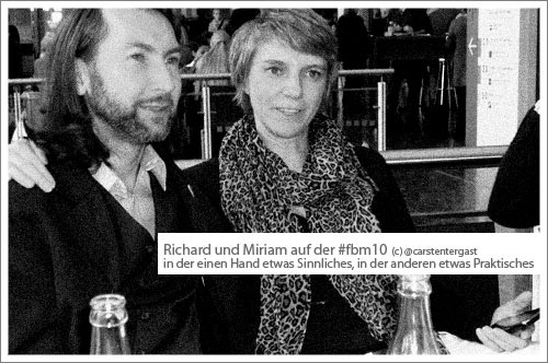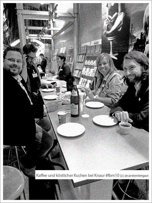 Fettnäpfchen: dass ich @heikeschmidt vom UTB-Verlag beim Twittagessen nicht zuordnen konnte, war mir sehr peinlich – da sie mich mit Namen ansprach (oder hatte sie einen Souffleur?) Carsten und DonBrandy @hedoniker (wie er mir gerade versicherte) lachten sich jedenfalls einen Wolf, wie ich peinlich berührt um Worte rang. Tja. Zu meiner Verteidigung sei gesagt, dass ich die gute Heike erst wenige Tage vor der Buchmesse virtuell kennen lernte. Am Freitag Abend, kurz vor Messe-Schluss, bin ich ihr dann noch schnell hinterher gelaufen und habe mich artig von ihr verabschiedet. Wirkt das jetzt mildernd?