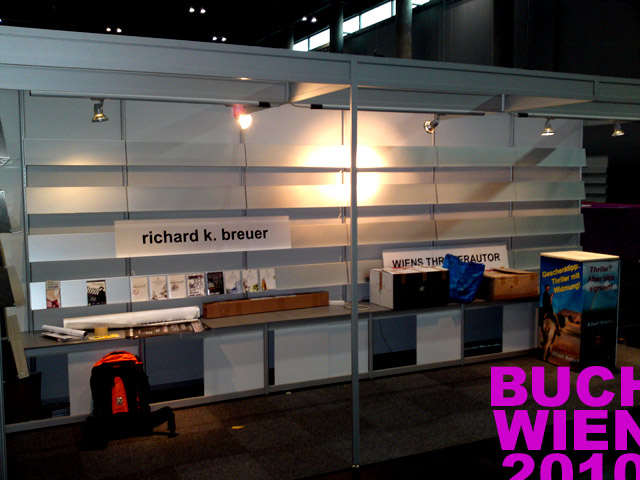 Heute also den Stand auf Vordermann gebracht. Lange herumprobiert. Regale verschoben. Eingesetzt. Abgesetzt. Zuerst das Riesen-Plakat Schwarzkopf in die Ecke gequetscht, dann doch auf die schmale Seite geklebt. Meine Folder und Flyer hübsch aufgereiht. Morgen, Mittwoch, werde ich die Bücher kurz auspacken und in die Regale stellen, dann, bevor die Party steigt, wieder wegräumen. Man hört ja immer wieder, dass so manches schwuppdiwupp wie durch Zauberhand verschwindet. Lange Finger, sozusagen. Mit ein Grund, die Idee, unsere Buch-Trailer am TV zu zeigen, fallen zu lassen. Wobei, das Ö1-Mobil hat einen Breitbild-Fernseher. Vielleicht kommen wir ja mit Didi ins Geschäft. Oder mit der Verantwortlichen des 3SAT-Standes. Das hätte natürlich Stil.