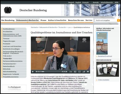 Gestern gab es im Deutschen Bundestag eine interessante Debatte über die »Qualitätsprobleme im Journalismus und ihre Ursachen« – den Fragen der Politiker stellten sich unter anderem die Medien Zeit online, Spiegel online und Süddeutsche Zeitung (SZ). Die Debatte, besser: Gespräche dauern beinahe zwei Stunden. Herausgreifen würde ich die „Mythen“-Dekonstruierung von Wolfgang Blau, Chefredakteur von Zeit online (gleich zu Beginn des Videos) und die Vergangenheits-Gegenwarts-Darstellung eines Hans Leyendecker von der SZ, der von seinem Alter und seiner gereiften Anschauung sicherlich als Journalist der alten Schule gelten darf. Sonst kann ich nicht viel mehr dazu sagen, weil ich mir auch nicht den Rest angesehen habe. Dafür werde ich nicht bezahlt. Warum sollte ich es also tun?