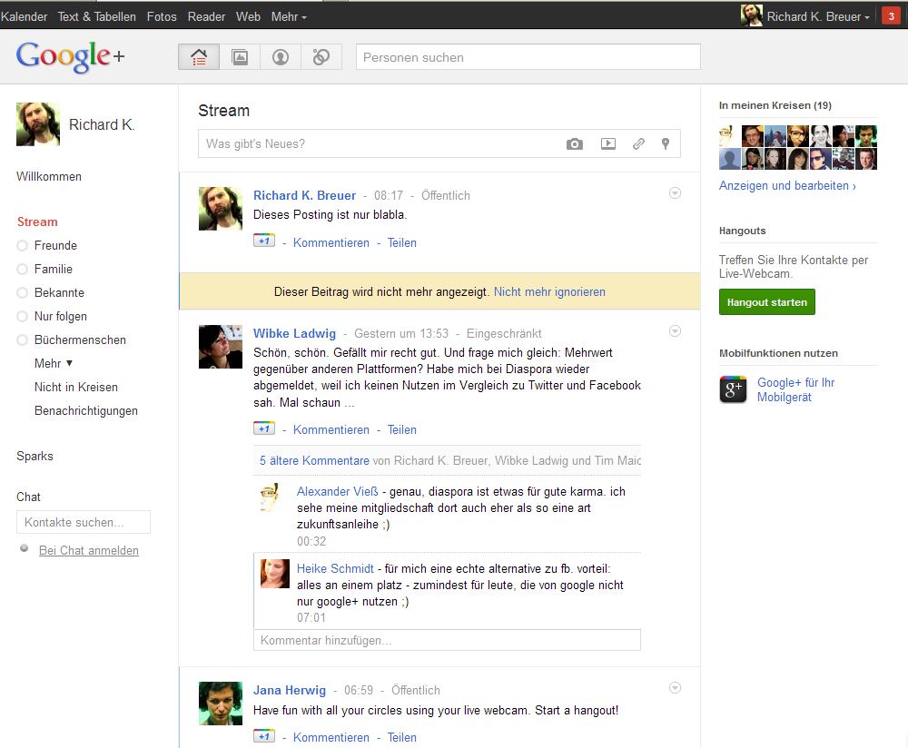 Gestern haben sich also viele der üblichen Verdächtigen in meinen Kreisen bewegt. In der Tat gibt es in Google+ die Möglichkeit, seine Beziehungen in Listen oder Kreisen anzuordnen. So könnte man einen Kreis mit seinen Fußball-Spezis machen und etwaige Beiträge nur für sie freischalten (man will ja keinen Platz- respektive Profilsturm aufgebrachter Fans auslösen). Das ist natürlich gewöhnungsbedürftig. Klar. Damit muss man erst lernen, umzugehen. Überhaupt ist ja jedes neue Tool, jedes neue soziale Netzwerk eine stetige Herausforderung an Körper und Geist. Kommt nicht von ungefähr, wenn es heißt, dass man ein Leben lang lernen müsse.