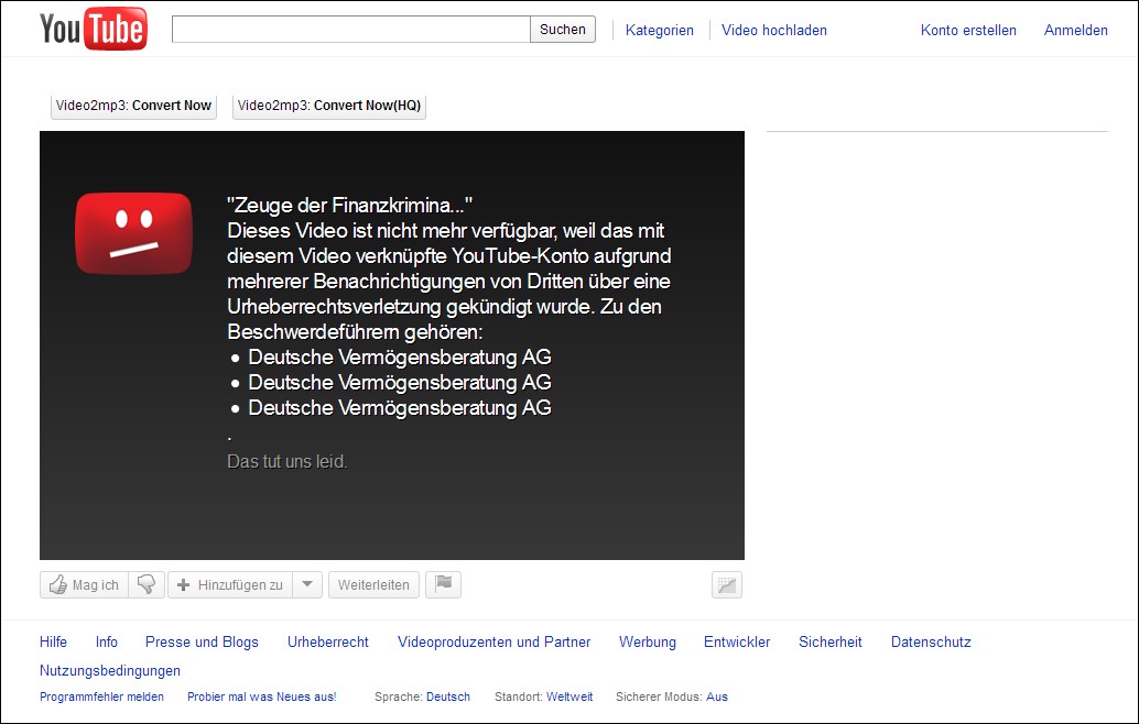 Der youtube-Clip Zeuge der Finanzkriminalität mit dem Journalisten Dr. Schumann wurde ratzeputz aus dem Verkehr gezogen. Grund: Urheberrechtsverletzung – eingebracht von der Teudschen Fermögensperatungs AG – laut deren Webseite eine der größten eigenständigen Vinanzfertriebe mit 37.000 Fermögensberatern. Ich schätze, da dürften einige Perater Zeit und Muße haben, das Internetz nach Urheberrechtsverletzungen zu durchforsten – ich hoffe, die Satire ist angekommen. Dass der Inhalt des Clips vermutlich kritische Töne gegen die Finanzindustrie gesungen hätte, nun, das ist freilich irrelevant, nicht? Und wenn Sie noch immer denken, diese ganze Internetz-Urheberrechts-Debatte hätte mit Beatles- und Rolling Stones- und Justin Bieber-Songs oder mit armen brotlosen Musikern und Schriftstellern zu tun, äh, ja, dann würde ich sagen, schlafen Sie bitte weiter und stören Sie nicht meine Kreise.