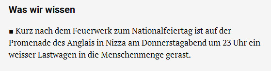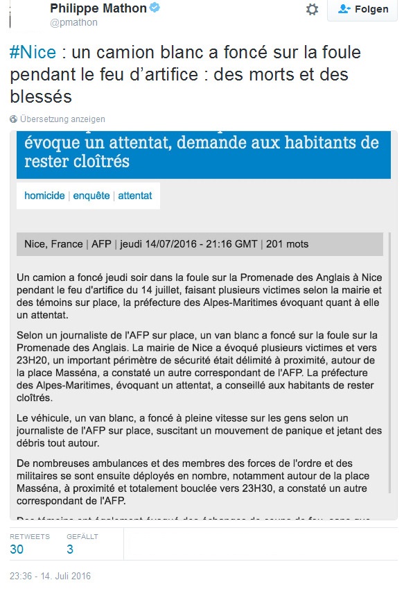 Um 23h16 verlautet die französische Nachrichtenagentur AFP folgende Meldung: »Laut einem Journalisten der AFP vor Ort, ist ein weißer Lieferwagen [van] auf der Promenade des Anglais in die Menge gerast.« Selon un journaliste de l’AFP sur place, un van blanc (!) a foncé sur la foule sur la Promenade des Anglais. [twitter]. — Im Französischen würde man einen LKW mit camion bezeichnen. Sollte sich der Journalist geirrt haben? Oder war es einfach nur ein Missverständnis? Im Englischen bezeichneten viele Augenzeugen, den LKW als big van.