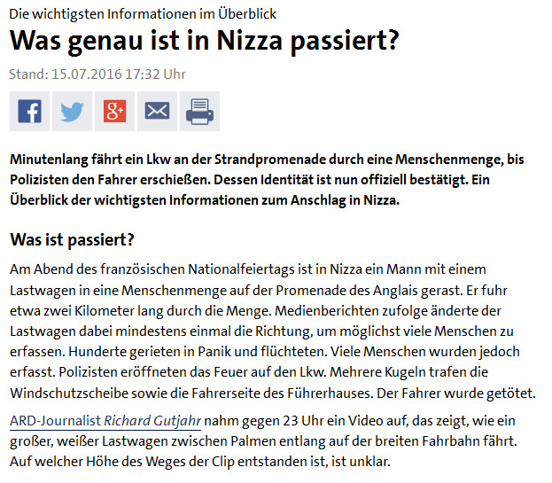 Moderatorin: »Das ist eben erst passiert, gegen 23 Uhr.« – Gutjahr: »Kurz nach Ende des Feuerwerks gingen die Lichter wieder an, als ein LKW …« — ARD-Nachtmagazin (ausgestrahlt 15.07./00:01) — Online