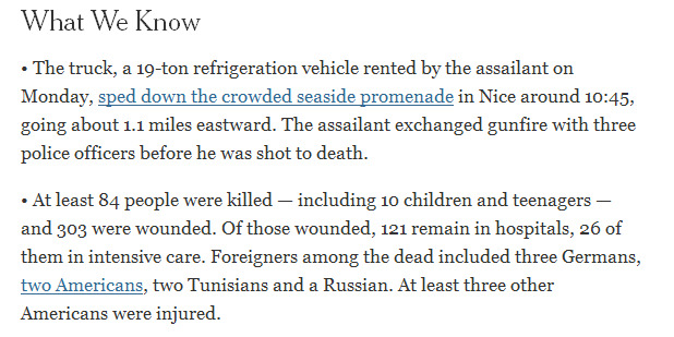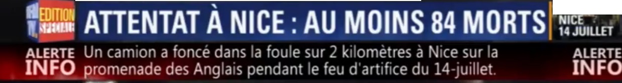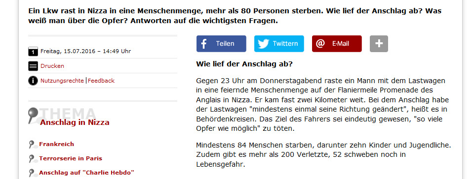 Offiziell ist die Opferzahl bei diesem Event noch immer nicht exakt angegeben – Daten entnommen am 16.08.2016/30.08.2016: Wiki/Fr: 84/86 Tote und 286/434 Verletzte; Wiki/E: 84 Tote und 303/307 Verletzte; Wiki/D: 84/86 Tote und ‚mehr als 300 Verletzte‘; Wiki/ITA: 84/86 Tote und 302/302 Verletzte;