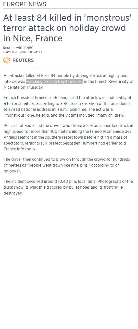 So Augenzeugen und Behörden von einem Feuerwerk sprechen, nehme ich an, dass diese sich auf jenes Feuerwerk beziehen, welches in Nizza um 22 Uhr begann und um 22h20 zu Ende ging. Ein interessanter Aspekt ist dabei der Umstand, dass die ersten Meldungen in den Medien von einem Unfall während des Feuerwerks sprachen (pendant le feu d’artifice du 14 juillet), beispielsweise die Zeitung Le Figaro (online), der französische Nachrichtensender BFMTV (Einblendung im laufenden Programm), die Nachrichtenagentur dpa (online), der US-TV-Sender CNBC mit Reuters (online) oder der französische Radiosender France Info (online). Erst am nächsten Tag wurde der Zeitpunkt der LKW-Fahrt schließlich auf »kurz nach dem Feuerwerk« geändert.