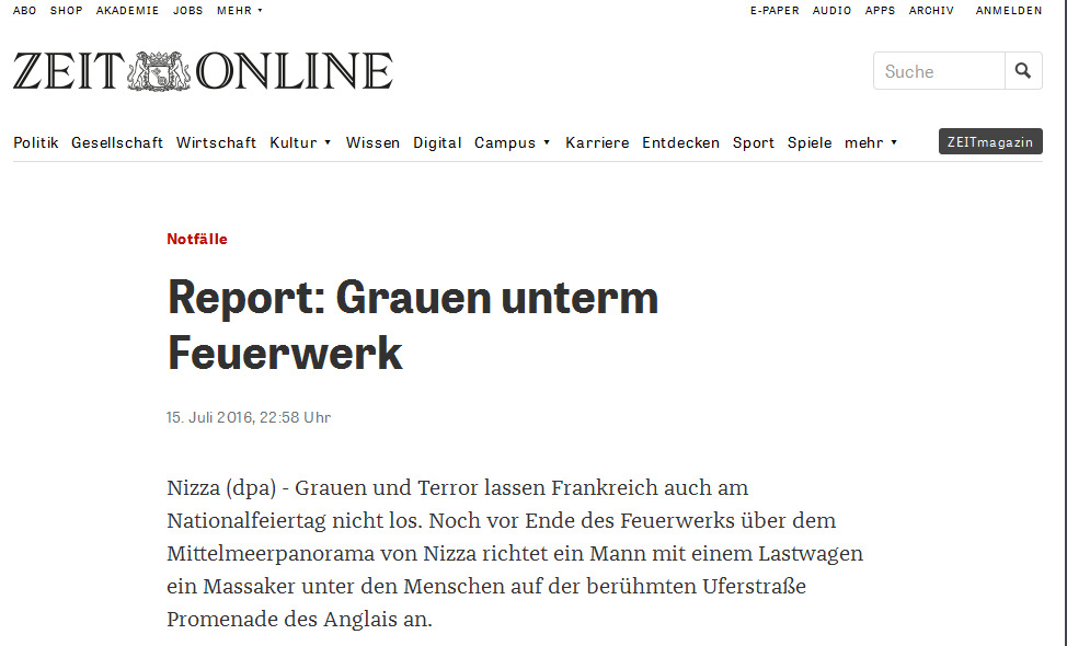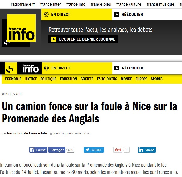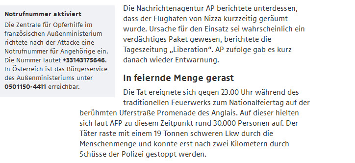 Anmerkung: Beim Centre universitaire méditerranéen erfolgte die Meldung der Polizei über den verrückten LKW um 22h33 – trotzdem fügte die Spiegel-Redaktion in den Artikel eine falsche Uhrzeit ein: »Es ist der 14. Juli, gegen 23 Uhr. ‚Wir wollten zum Feuerwerk.’« – Da das Feuerwerk in Nizza um 22h20 zu Ende ging und Franck das hätte wissen müssen, ist die Zeitangabe im Artikel völlig widersinnig – im Originalartikel steht das deshalb auch so nicht dort.