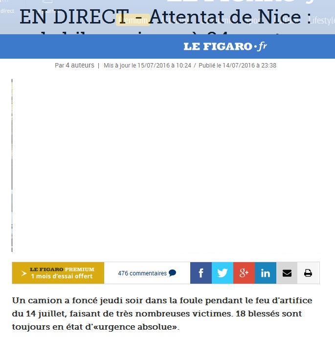 Hören Sie sich das Interview mit Antoine Chauvel, einem in Nizza lebenden Fotografen in aller Ruhe an. Sehen Sie sich seine Aufnahmen an. Die Bilder entstanden, laut seiner Aussage, nach 23 Uhr. Es vergingen (drei) Stunden, bis die Rettungskräfte eintrafen bzw. tätig wurden und die Toten hätte man deshalb mit Tischtüchern der umliegenden Restaurants zugedeckt. Sagt Antoine Chauvel. Über seine große Nervosität wollen wir jetzt mal nicht befinden, aber warum man gerade ihn als Augenzeuge des Events ausgesucht hat, ist mir ein Rätsel, da er ja zu Hause war, als der LKW, wie es offiziell so schönschrecklich heißt, durch die Menge pflügte. Ja, wir müssen dem Moderator beipflichten: nobody understands it. Wie dem auch sei, kommen wir zum wesentlichen Punkt.