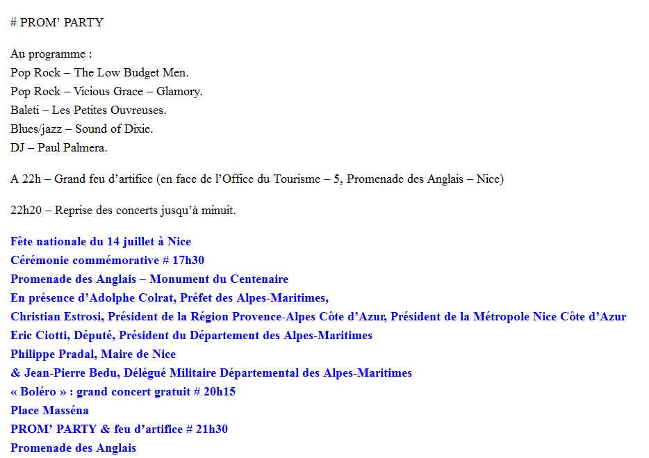 Bezüglich des Feuerwerks (feu d’artifice) in Nizza gibt es eine Reihe von widersprüchlichen und (vermutlich) falschen Angaben, sowohl in den Medien als auch in den Augenzeugenberichten. Wie ist das zu erklären? Ein Feuerwerk beginnt zu einer weit im Vorhinein festgelegten Zeit und endet nach einer bereits weit im Vorhinein bekannten Dauer an einem vorher exakt bestimmten Ort. In den öffentlichen Aussendungen [online] wurde der Beginn des Feuerwerks mit 22 Uhr gegenüber der Touristeninformation angegeben. Nach etwa zwanzig Minuten, gegen 22 Uhr 20 sollte das Straßenfest, das für das Feuerwerk unterbrochen wurde, bis Mitternacht fortgesetzt werden: