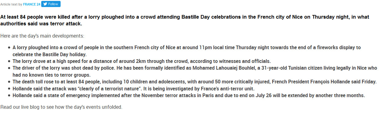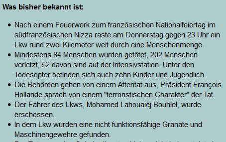 »Präsident François Hollande bestätigt im TV, dass es 84 Tote und etwa 50 Verletzte gäbe, mehr als bis jetzt gemeldet wurde.«