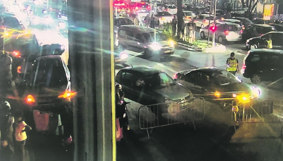 Hier sehen wir eines der wenigen Fotos von der Promenade des Anglais, Höhe Boulevard Gambetta. Man sieht die Absperrung der Straße durch zwei Metallgitter. Die Aufnahme dürfte während des Feuerwerks gemacht worden sein, da die Passanten allesamt in Richtung Meer blicken. So, wie es aussieht, dürfte der Verkehrsfluss stockend gewesen sein.