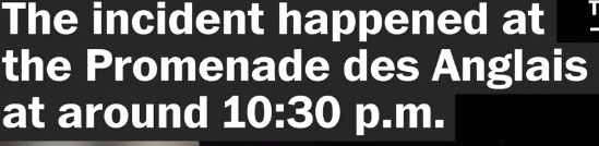 »›Als wir auf der Höhe des Universitätszentrums Mittelmeer waren, haben wir plötzlich hinter uns eine Bewegung der Menschenmenge bemerkt. Wir hörten Schreie und sahen Autos, die sich quer stellten. Meine Frau sagt mir: ‚Halt an, da stimmt was nicht‘. Als wir uns umdrehten, sahen wir die Menge auf uns zu rennen, sie flohen vor irgendwas. Und dann sahen wir den Lastwagen näher kommen. Wir waren auf der Mitte der Straße, es gab wenig Autos. Ich fuhr mit rund 60 km/h pro Stunde, hatte nicht mal die Zeit in den Rückspiegel zu sehen, als mich der Lkw in voller Fahrt überholte.‹ Mit dem Motorroller fuhr er auf den Bürgersteig [Gehstreifen]. ›Ich sehe noch die Bilder von Körpern, die überall umherflogen.‹«