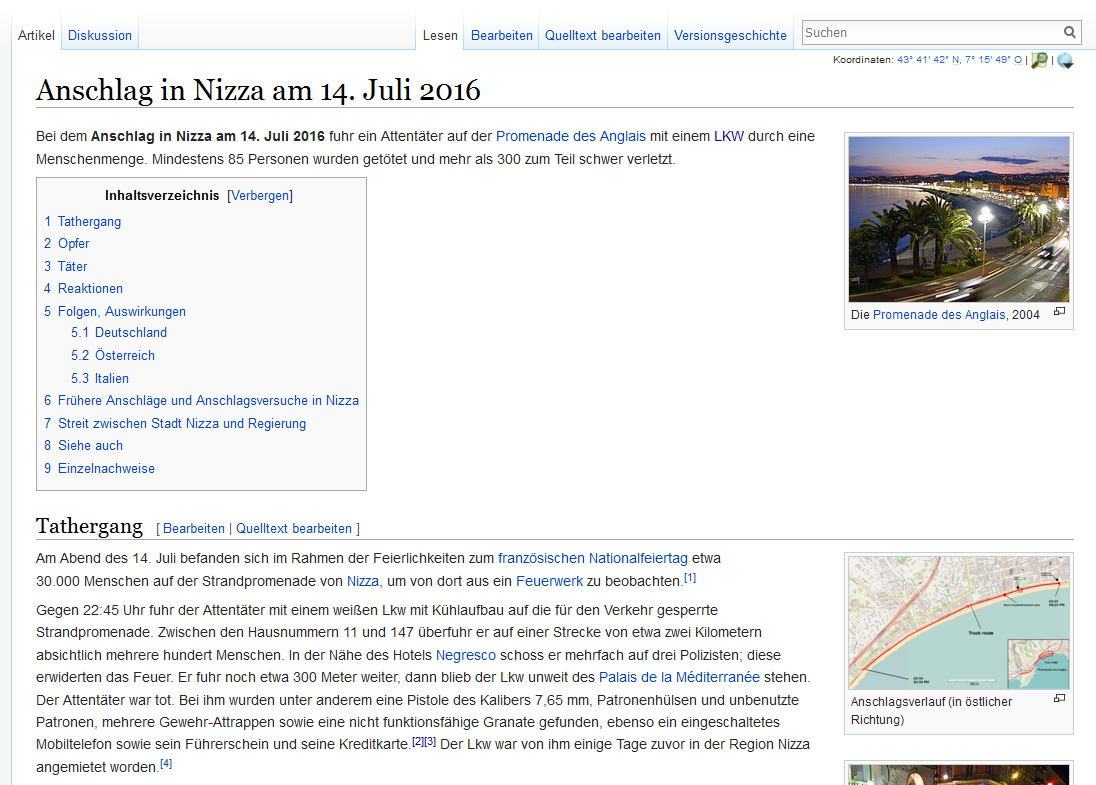 Zurück zu Nizza und den Schichten an Pseudo-Wahrheiten. Die erste und oberste Schicht ist immer das offizielle Narrativ, welches auf einen Satz verkürzt, immer und immer wieder in medialen und politischen Aussendungen wiederholt wird. Auf diese Weise wird im Gehirn des Medienkonsumenten die offizielle Version fest verankert. Wikipedia spielt dabei eine zentrale Rolle. Dieses unabhängige und demokratisch geführte Lexikon reduziert jedes Ereignis auf das offizielle Narrativ und versucht dabei Widersprüche unter den Teppich zu kehren oder diese – mit großer Detailfreude verkompliziert – im Text zu verstecken. Mit heute, 30.08.2016, über eineinhalb Monate nach dem sogenannten Terroranschlag, lesen wir in der deutschen Wikipedia den folgenden Eintrag: