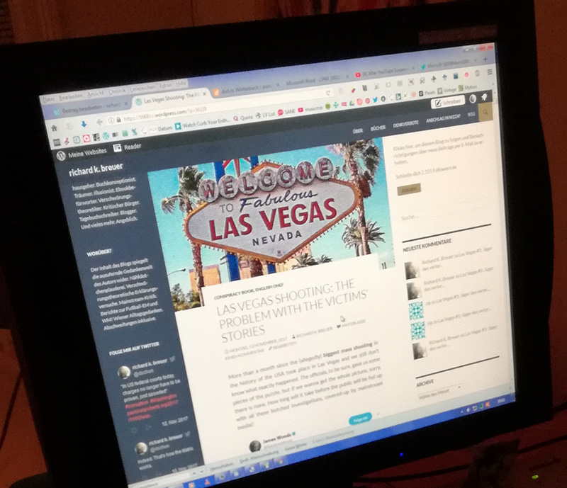 Heute werde ich also meine detaillierte Untersuchung zum vermeintlichen Amoklauf in Las Vegas online stellen. Mehr als zwei Wochen habe ich daran gearbeitet. Eine herrliche Zeit. Das Besondere an diesem Artikel? Er ist in Englisch verfasst. Auf diese Weise klopfe ich an die Tür der amerikanischen Truth Community. Werde ich mit meinem Beitrag etwas ändern können?