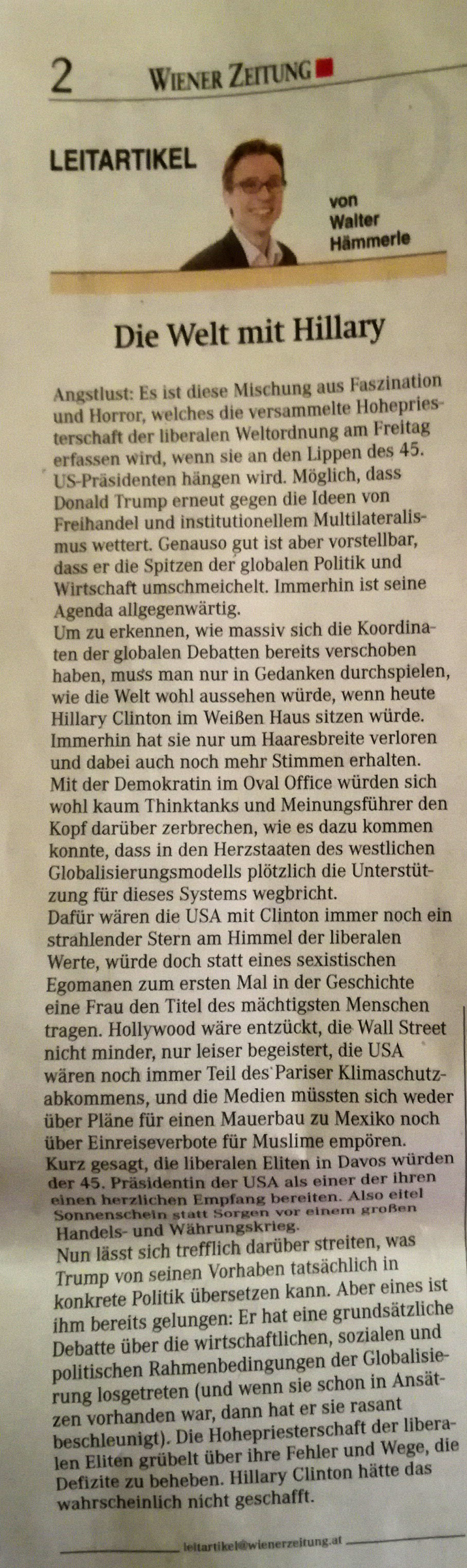 Heute bin ich durch Zufall auf den Kommentar des Vize-Chefredakteurs der altehrwürdigen Wiener Zeitung gestoßen. Es ist recht faszinierend, zu sehen, wie sich der gute Mann – gemeinsam mit all seinen anderen liberalen Kollegen hüben wie drüben – abmüht, die Illusionsblase gegenüber Präsident Trump nicht zum Platzen zu bringen und die kognitive Dissonanz der liberal gesinnten Leser nicht über Gebühr zu strapazieren. Doch hie und da muss auch der Pressemann und die Pressefrau über den Tellerrand gucken. In diesem Fall zieht der Redakteur vor Präsident Trump den Hut, weil er die „Hohepriesterschaft der liberalen Eliten“ zum Grübeln bringt. Der Kommentar endet damit – man möchte es nicht glauben – dass Hillary Clinton dies „wahrscheinlich nicht geschafft“ hätte. Allerhand, nicht wahr?