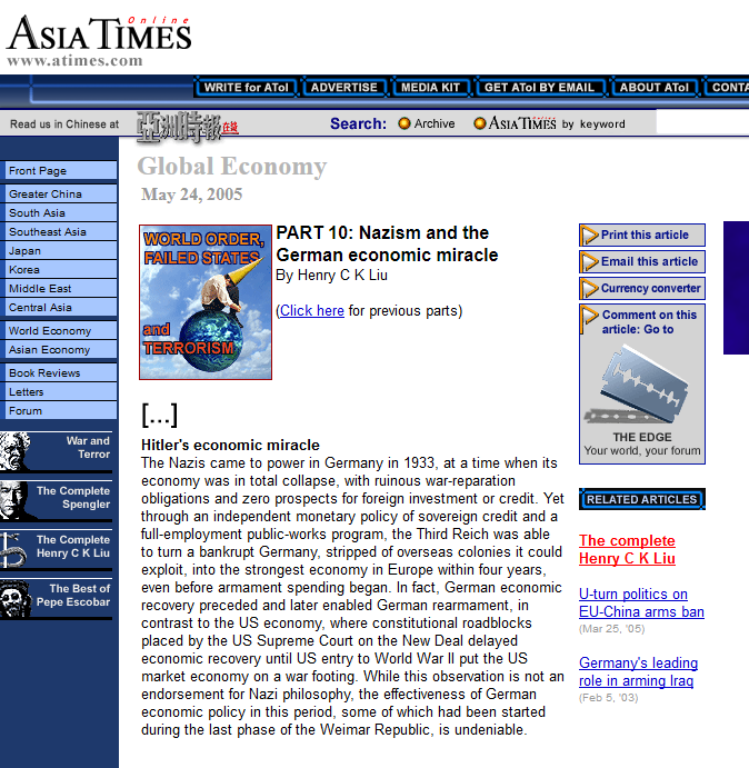 Möchte man beispielsweise Näheres über die deutsche Wirtschaftspolitik in den 1930ern in Erfahrung bringen, läuft man Gefahr, in die rechte Dornenhecke gestoßen zu werden. Dabei wäre es von unschätzbarem Informationswert, würde man wissen, warum die Deutschen ein Wirtschaftswunder hatten und der Rest der Welt, inklusive dem kleinen Österreich und dem großen Amerika, nicht. Die lapidare Antwort darauf war und ist immer: „Rüstungsindustrie“. Will man sich mit dieser Antwort nicht zufrieden geben, muss man schon weite Wege gehen, um alternative Sichtweisen zu finden. In diesem Fall ist es ein Amerikaner mit chinesischen Wurzeln, der sich getraut, in der asiatischen Zeitung Asia Times Online einen Artikel zu publizieren, der sich mit dem Damals beschäftigt.