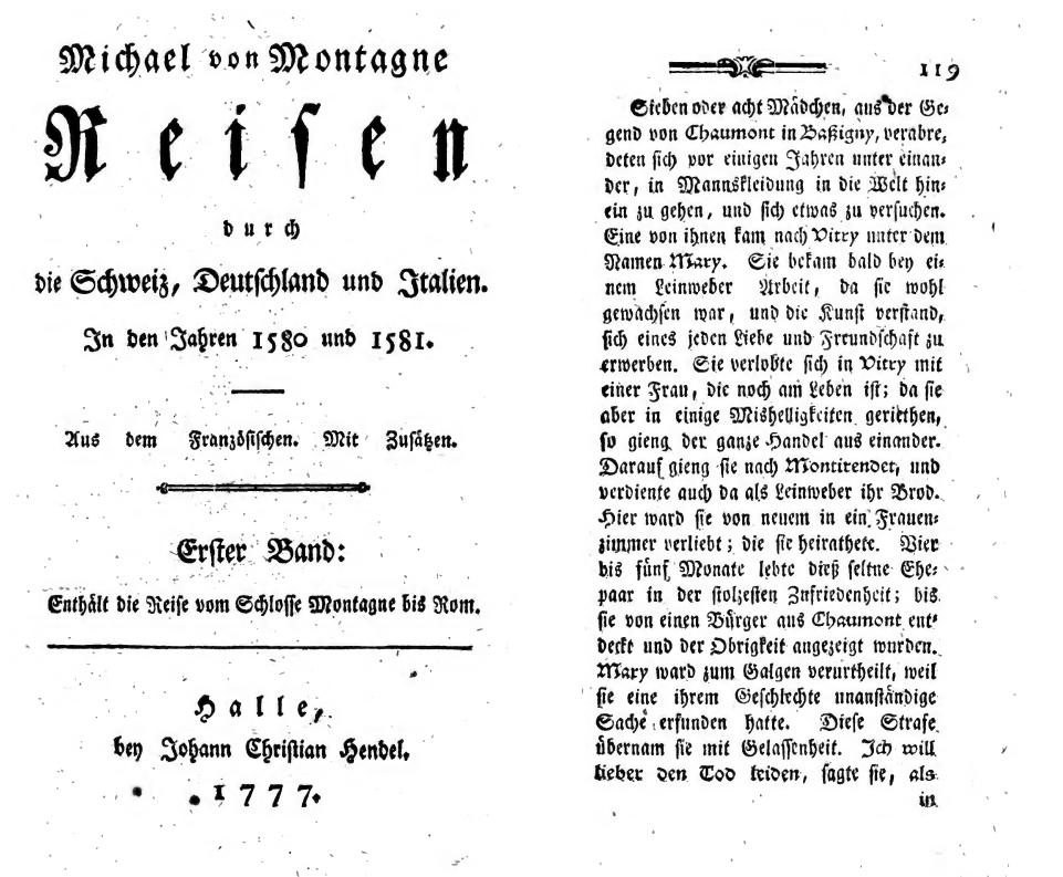 Im Jahre 1580 – eine gute Weile ist das schon her – hat sich der gute Michel de Montaigne auf den langen Weg gemacht. Von Frankreich reiste er nach Italien, die „Fahrt“ ging dabei über Deutschland, die Schweiz und Tirol. Auf dieser langen Reise – vorwiegend zu Pferd zugebracht, während das Gepäck mit dem Wagen transportiert wurde – notierte er in seinem Reisetagebuch die eine oder andere merkwürdige Anekdote. Eine handelt von einem „seltnen Ehepaar“. Die Übersetzung ist von 1777, deshalb muthet die Rechtschreibung ein wenig eigen an. Aber so ist das. Andere Zeiten, andere Schreibweisen.