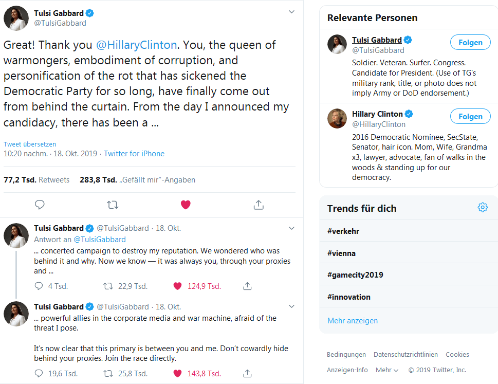 Jahre später, im beginnenden Vor-Wahlkampf der Demokraten, zeigt sich, dass die Ära der Clintons langsam zu Ende geht. Eine der Kandidatinnen für den Wahlkampf 2020, die Abgeordnete Tulsi Gabbard, weiß, als ehemalige Soldatin, was es heißt, in blutige Konflikte geworfen zu werden. Deshalb vertritt sie – als eine der ganz wenigen US-Politiker – eine pazifistische Grundeinstellung und lehnt militärische Interventionen in souveränen Staaten ab („regime change wars“). Sie war es auch, die die Initiative #StopArmingTerrorists befürwortete (blog). Grund genug für Hillary Clinton, die Kongressabgeordnete aus Hawaii über Umwege als „Putin-Liebchen“ hinzustellen: