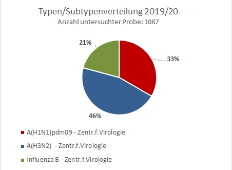 Sieht man sich die gegenwärtig Verteilung der Influenza-Virustypen in Österreich an, so ergibt sich bei einer Anzahl von 1087 eingeschickten Proben die folgende Verteilung: