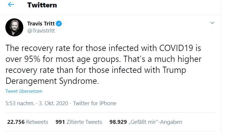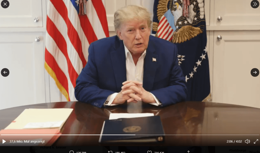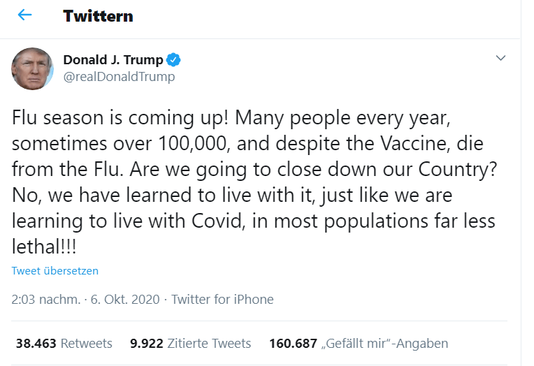 Der Präsident der Vereinigten Staaten wurde positiv auf Covid-19 getestet, hieß es aus dem Weißen Haus. Rätselraten bei der gegnerischen Partei: Ist alles nur ein Trick? – und Sorge bei seinen Anhängern: Könnte er gesundheitliche Folgeschäden davontragen? Aber bereits nach wenigen Tagen kehrte Trump wieder „nach Hause“ zurück und ließ seine Bürger in einer kurzen Videoansprache wissen, dass sie sich nicht vor der Krankheit fürchten müssen. Später twitterte er, dass Grippe trotz eines Impfstoffes tödlich sein kann und die Menschheit gelernt hat, mit dieser Krankheit zu leben, ohne lockdowns (oder Maskenpflicht).