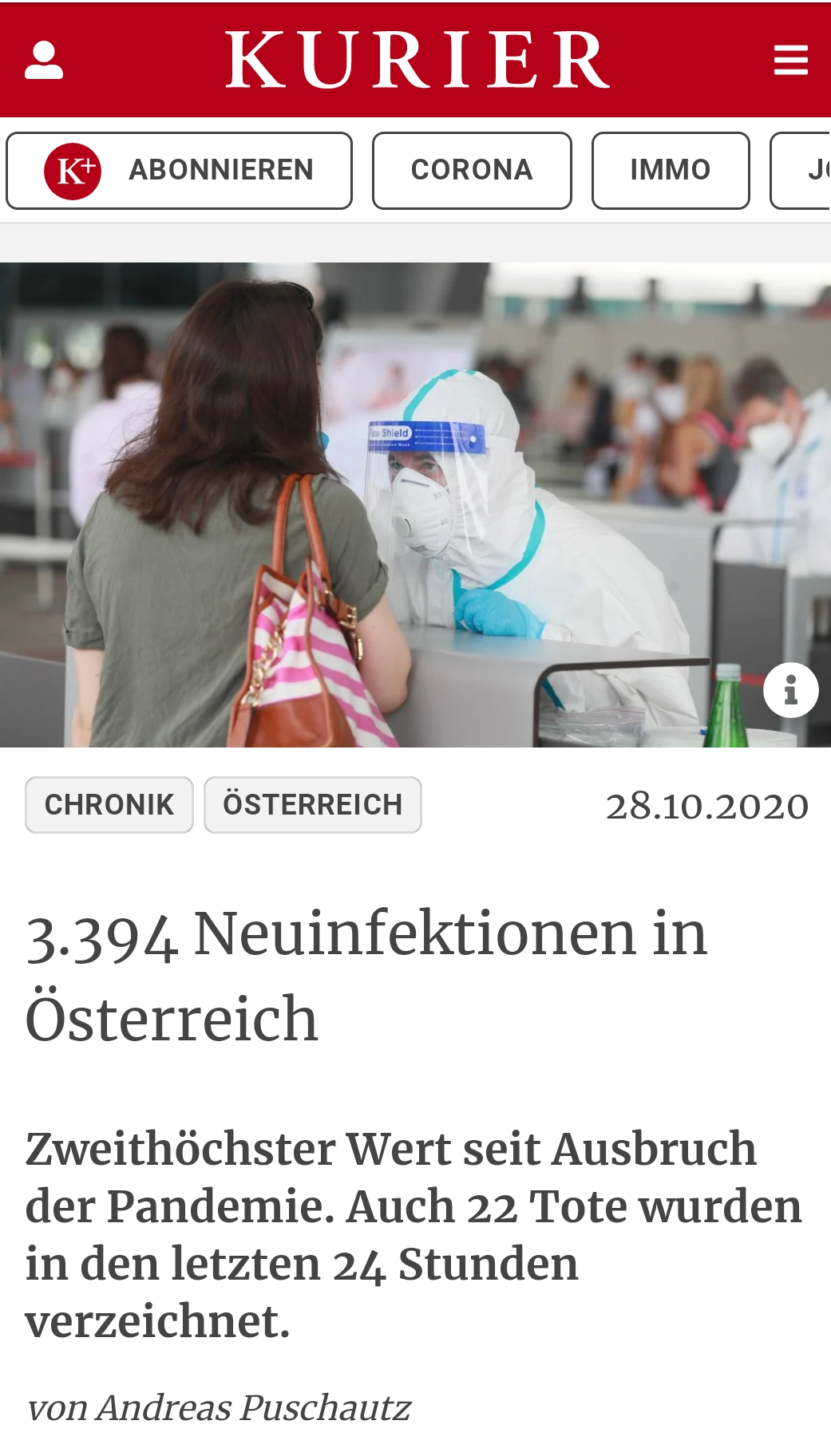 Vor wenigen Tagen erhielt ich auf meinem klugen Mobiltelefon die Nachricht der österreichischen Tageszeitung KURIER, die zwischen Boulevard- und Qualitätsblatt pendelt, dass es 3.394 Neuinfektionen* in Österreich gäbe, was den „zweithöchsten Wert seit Ausbruch der Pandemie“ darstelle. Für gewöhnlich ärgere ich mich nur über die mediale Panikmache, aber dann dachte ich mir, es wird nun mal Zeit, ein paar ernste sachliche Worte darüber zu verlieren, um das angsteinflößende mediale Bild geradezurücken.