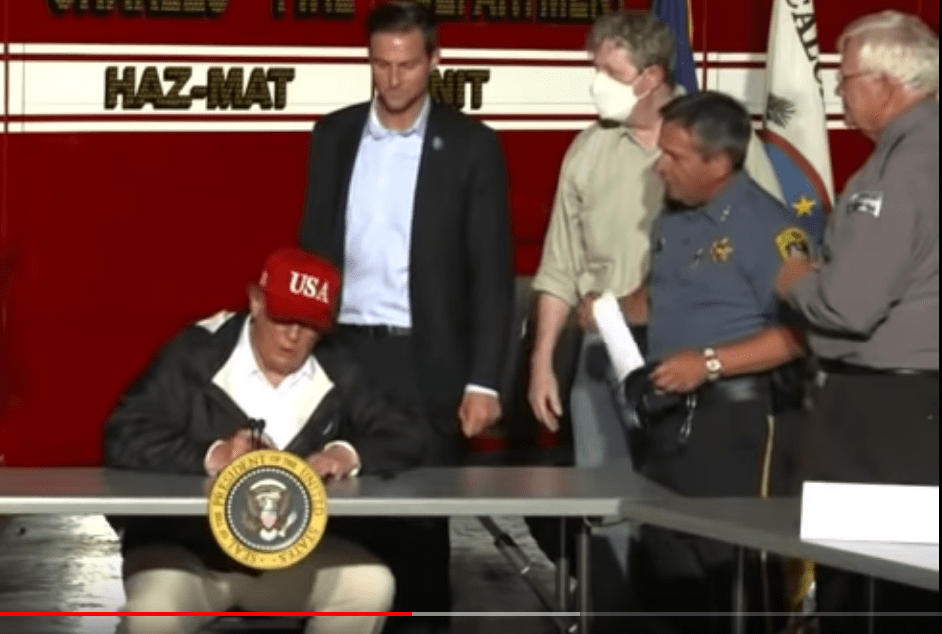 Sehen Sie sich kurz diesen unten angeführten Clip an. Nach einer Naturkatastrophe biblischen Ausmaßes – Hurrikan Laura zog eine verheerende Spur durch die Südstaaten der USA – reiste Trump an Ort und Stelle und ließ sich vom Ausmaß der Katastrophe informieren. Als das Briefing vorbei ist, nimmt Trump noch einmal Platz, zückt einen Stift und kritzelt seine Unterschrift auf ein Papier. Er schiebt es einem der abgekämpften Einsatzleiter zu und sagt schlicht: