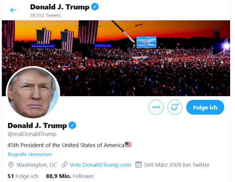 Deshalb hat sich auch Präsident Trump bezüglich der Wahl noch nicht zu Wort gemeldet. Im Gegensatz dazu können Sie auf seinem privaten twitter-feed @realDonaldTrump täglich eine Reihe von Äußerungen lesen. Ungefiltert! Pur! Ohne medialen Spin!