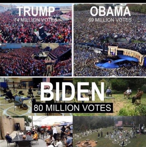 Während Trump täglich mehrere Kundgebungen (rallys) absolvierte, die von zigtausend begeisterten Zuschauern bevölkert war, saß Biden in seinem Haus und sinnierte über die Tapeten des Oval Office nach. Die seltenen Auftritte Bidens, beispielsweise auf einem grauen Parkplatz, waren so inhaltsleer und einschläfernd, dass es nicht weiter verwundert, dass er keine Begeisterung bei seiner Wählerschaft auslösen konnte. Im Gegensatz dazu standen Trumpers stundenlang in der Kälte, um bei einer seiner vielen Kundgebungen dabei sein zu können. Es entwickelten sich spontane Zusammenkünfte. Auf den Straßen fuhren riesige Autokolonnen mit Fahnen und Wimpeln. Egal wohin man seine Augen richtete, die Begeisterung auf den Straßen war spürbar, erfahrbar und sichtbar.