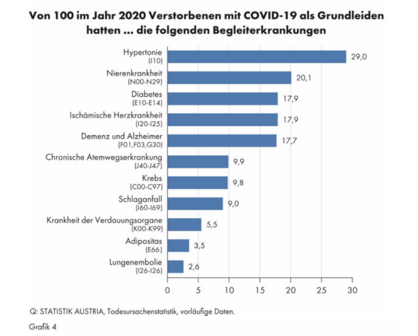 Die Statistik Austria weist die sogenannten „Begleiterkrankungen“ bei „Covid-19-Grundleiden“ aus. Wie die Unterscheidung zwischen Begleiterkrankung und Grundleiden zustande kam, ist nicht festzustellen. Dabei kann ein Patient auch mehrere Begleiterkrankungen gehabt haben.