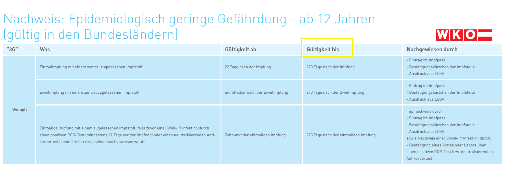Die Wirtschaftskammer Österreichs (WKO) stellte eine hübsch übersichtliche Tabelle ins Netz, um dem gewöhnlichen Bürger die 3G-Regel verständlich zu machen. Nach dieser Aufstellung sind die verabreichten Injektionen mit neuster (gen-modifizierender) mRNA-Technologie vorerst einmal 270 Tage lang gültig. Was mag nach Verstreichen der Gültigkeit geschehen? Booster-Shot? Auffrischungszuckerln? Verlängerung der Gültigkeit?