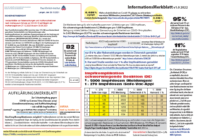 Ein InfoMerkblatt (A4 Querformat) mit den wichtigsten Daten und Fakten sowie Diagramme zu wesentlichen Informationen sind ebenfalls auf der Seite Covid-19 zu finden. Sehr zu empfehlen, falls Sie das nächste Mal bei einer Impfpflicht-Diskussion in Erklärungsnotstand geraten. Das Ergebnis der Analyse zeigt nämlich klar und deutlich, dass die Impfung mehr schadet als sie nützt und Covid-19 nicht so gefährlich ist wie oftmals in den Medienkanälen behauptet.