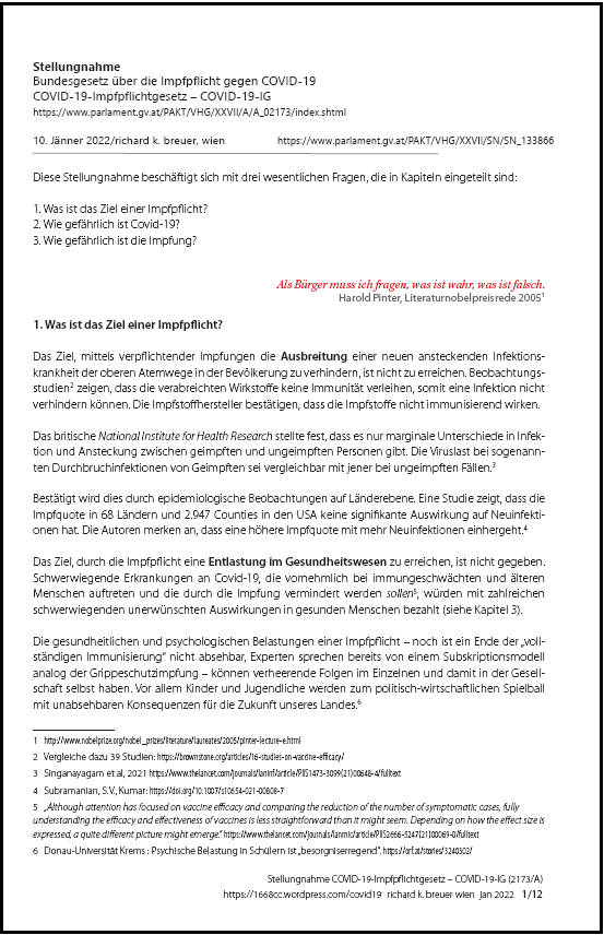 Meine fundierte und stets aktualisierte Stellungnahme zum Impfpflichtgesetz kann auf meiner Seite Covid-19 heruntergeladen werden. Sollte es neue Erkenntnisse geben, werde ich mir erlauben, die Analyse zu ergänzen. Eine Anfrage an die Abgeordneten zum Nationalrat vom Februar 2022 bezüglich Impfrisiko ist genauso abrufbar wie eine Durchsicht der Datenlage samt einer Auswahl der interessantesten Daten und Fakten.
