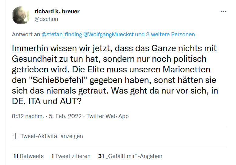 Deshalb müssen wir, die aufgeklärten Bürger, die dieses Unheil klar vor Augen sehen, gegen diese politische Machtergreifung vorgehen. Das Impfpflichtgesetz hat klar und deutlich gezeigt, dass eine frühe Form der Technokratie weder Menschlichkeit noch Einfühlungsvermögen kennt, sogar bereit ist, das Land und die Gesellschaft in einen Konflikt zu treiben, der viel Leid auslösen wird.