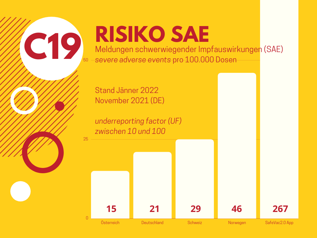 Sieht man sich unvoreingenommen die offiziellen Daten zu den Meldungen schwerwiegender Impfauswirkungen (SAE) an, dann zeigt sich, dass es große Unterschiede innerhalb der Länder selbst gibt. Entlarvend hingegen ist die deutsche SafeVac-App, in der die Benutzer aktiv und regelmäßig nach ihrem Gesundheitszustand gefragt werden. Hier geht die Zahl der Meldungen von schwerwiegenden Impfauswirkungen durch die Decke und führt eindrücklich vor Augen, dass die tatsächlichen Meldungen um ein Vielfaches höher liegen müssen.