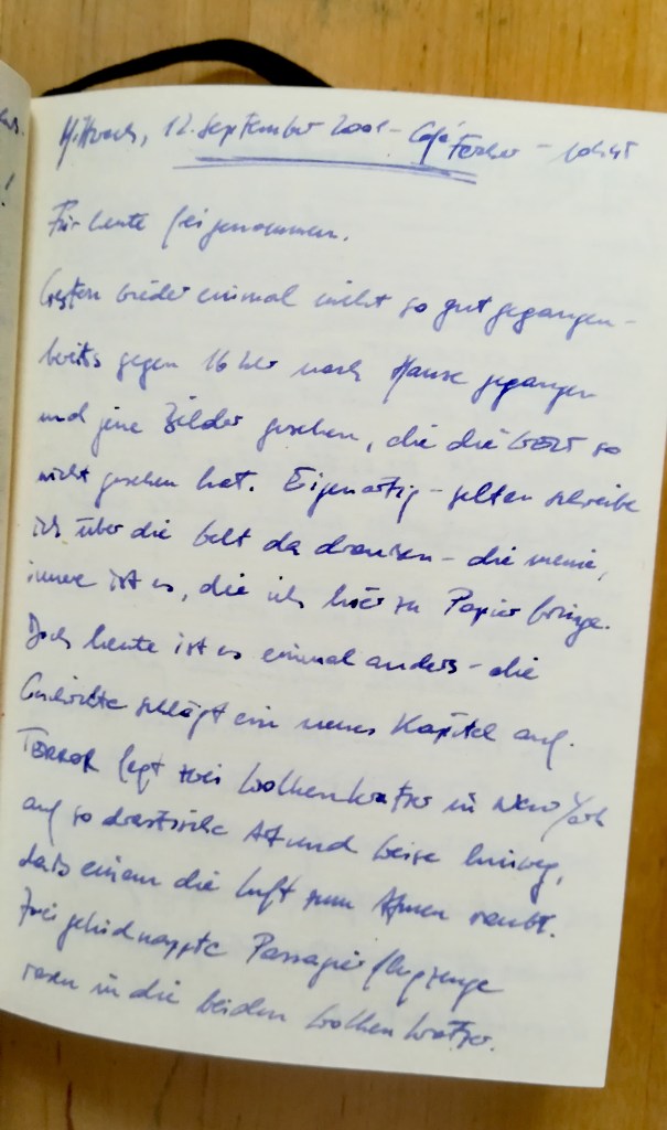 Ich habe mir die Mühe gemacht, aus dem Berg an Tagebüchern jene Stelle zu finden, die sich mit dem 11. September 2001 (9/11) auseinandersetzt. Damals war ich nicht mehr jung, noch nicht alt – und mein Interesse lag vorrangig im Zwischenmenschlichen – die Schriftstellerei war noch nicht geboren. Politik – im Inneren wie im Auswärtigen – interessierte mich nur am Rande, aber ich wusste instinktiv, dass die Ereignisse an diesem Septembertag im Jahre 2001 ein neues Kapitel aufschlagen würden.
