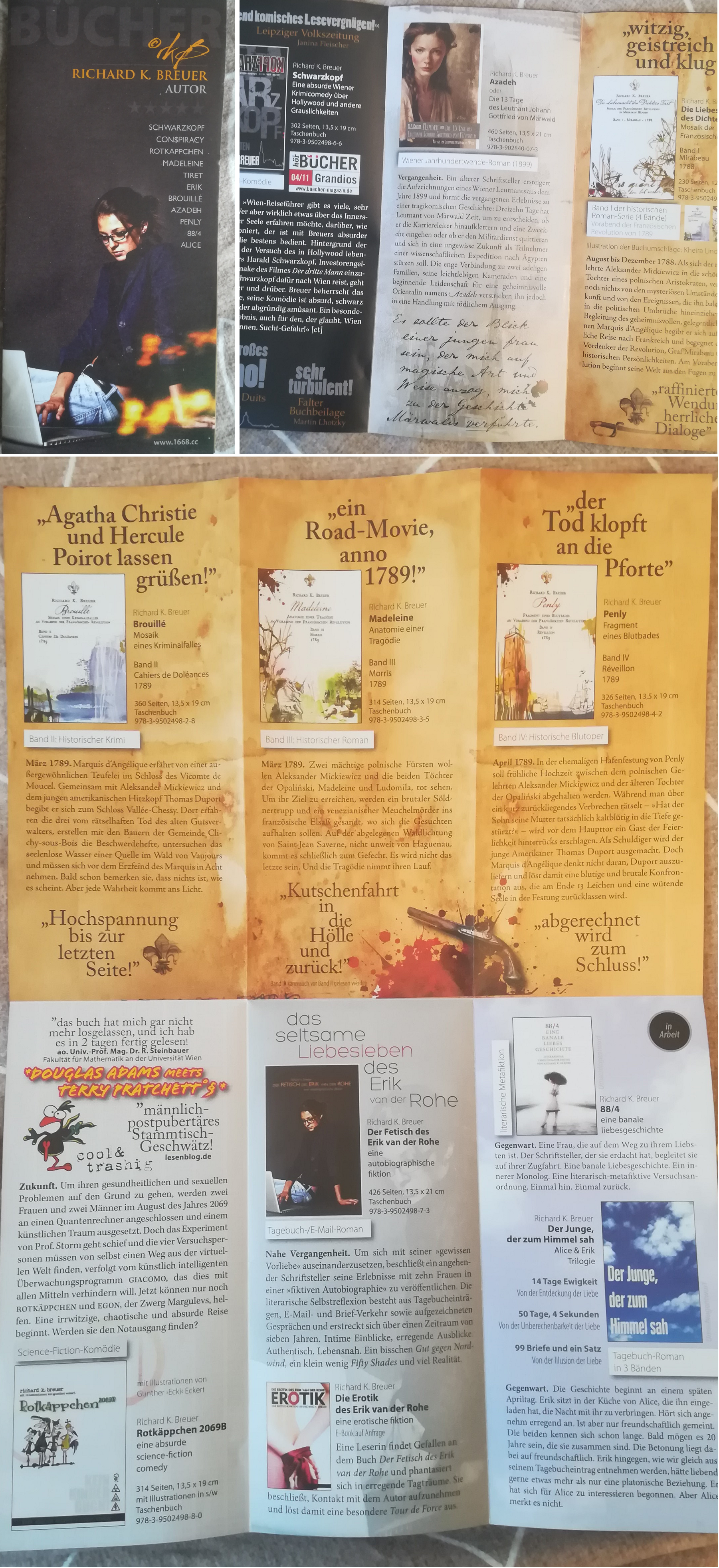 Gestern sind die beiden dicken Schachteln von der Druckerei gekommen. Der neue Folder mit 12 Seiten, der nach oben hin aufgeklappt wird, und meine Bücher im besten Licht präsentieren soll, sieht schmuck aus. Einziger Wermutstropfen ist, dass das Cover erst bei guter Ausleuchtung so richtig zur Geltung kommt. Ist es eines dieser milchig-düsteren Wiener Herbsttage, dann hebt sich das Jäckchen der Dame vom Hintergrund nicht sonderlich gut ab und verschwimmt darin. Man könnte also sagen, der Folder ist ein Sommerkind und gehört auf die helle Bühne gestellt.