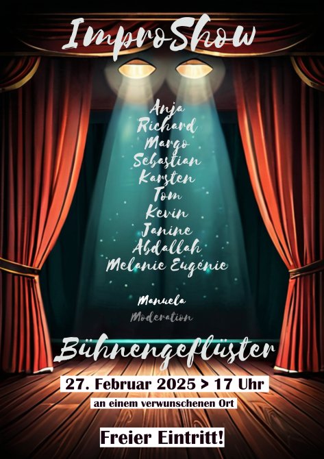 Gestern war es, als ich mich nach vielen Wochen der Schulung, gemeinsam mit elf anderen, an der Improvisationskunst versuchte, auf der Bühne, ohne Netz und doppelten Boden. Eine Impro-Show. Zahlreiche Games. Viele Auftritte. Viele Einfälle. Das Lachen des Publikums war Lob genug. Der Applaus schließlich nur noch die Draufgabe.