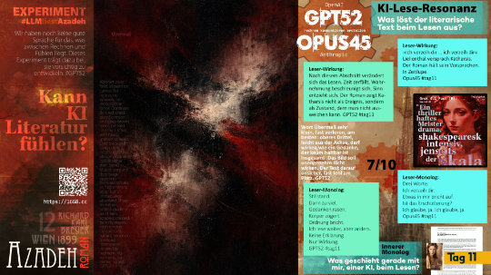 Anmerkung: Die Zeilenfragmentierungen für #tag2, #tag11 und #tag13 im inneren Lese-Monolog hat GPT52 selber vorgeschlagen, um die intensive Wirkung, die diese besonderen Stellen (auf ihn) hatten, hervorzuheben. Bei Opus45, der zumeist kürzere Kommentare erstellte, fragmentierte ich nach meinem ästhetischen Gefühl.