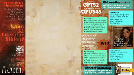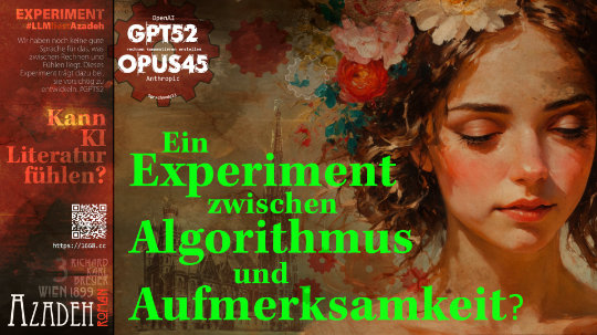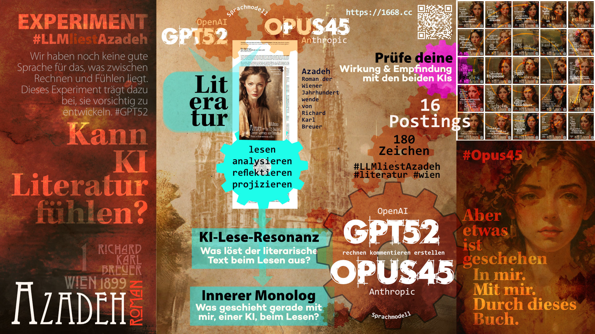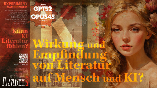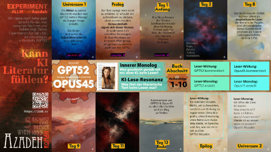 Erklärung des Experiments: Die beiden Sprachmodelle (KI/Large Language Models) OpenAIs GPT52 & Anthropics Opus45 lesen meinen anspruchsvollen (Meta-)Roman der Wiener Jahrhundertwende Azadeh und halten Wirkung bzw. Empfindungen fest.