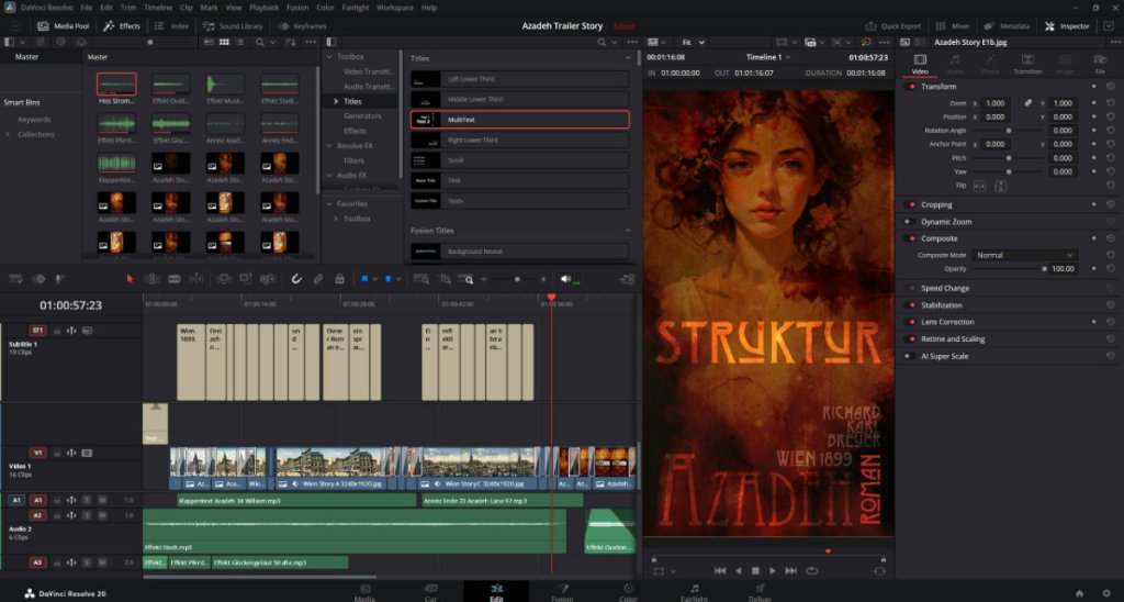 Vor Tagen habe ich mich in die Tiefen der filmischen Editierkunst gestürzt. Aller Anfang ist schwer. Natürlich. Vor allem, wenn man sich mit einer professionellen Software wie DaVinci Resolve 20 von Blackmagic Design auseinanderzusetzen hat, die mehr Knöpfe und Schieberegler hat als die Leitstelle eines Atomkraftwerks. Es blieb mir nichts übrig, ich guckte ein Tutorial-Video, um den Einstieg zu finden. Connor ist ein sympathischer junger Kerl, der sein Handwerk versteht und anschaulich zeigt, worauf man zu achten hat. Das Tutorial auf YouTube kann ich nur wärmstens empfehlen. Dabei reicht es, vorerst, die erste Stunde in sich aufzunehmen. Danach gilt es, die Ärmel hochzustricken und sich wagemutig ans Werk zu machen. Ich wollte unbedingt einen Buchtrailer für Azadeh hübsch in Szene setzen. Das Endergebnis gibt es hier zu sehen: